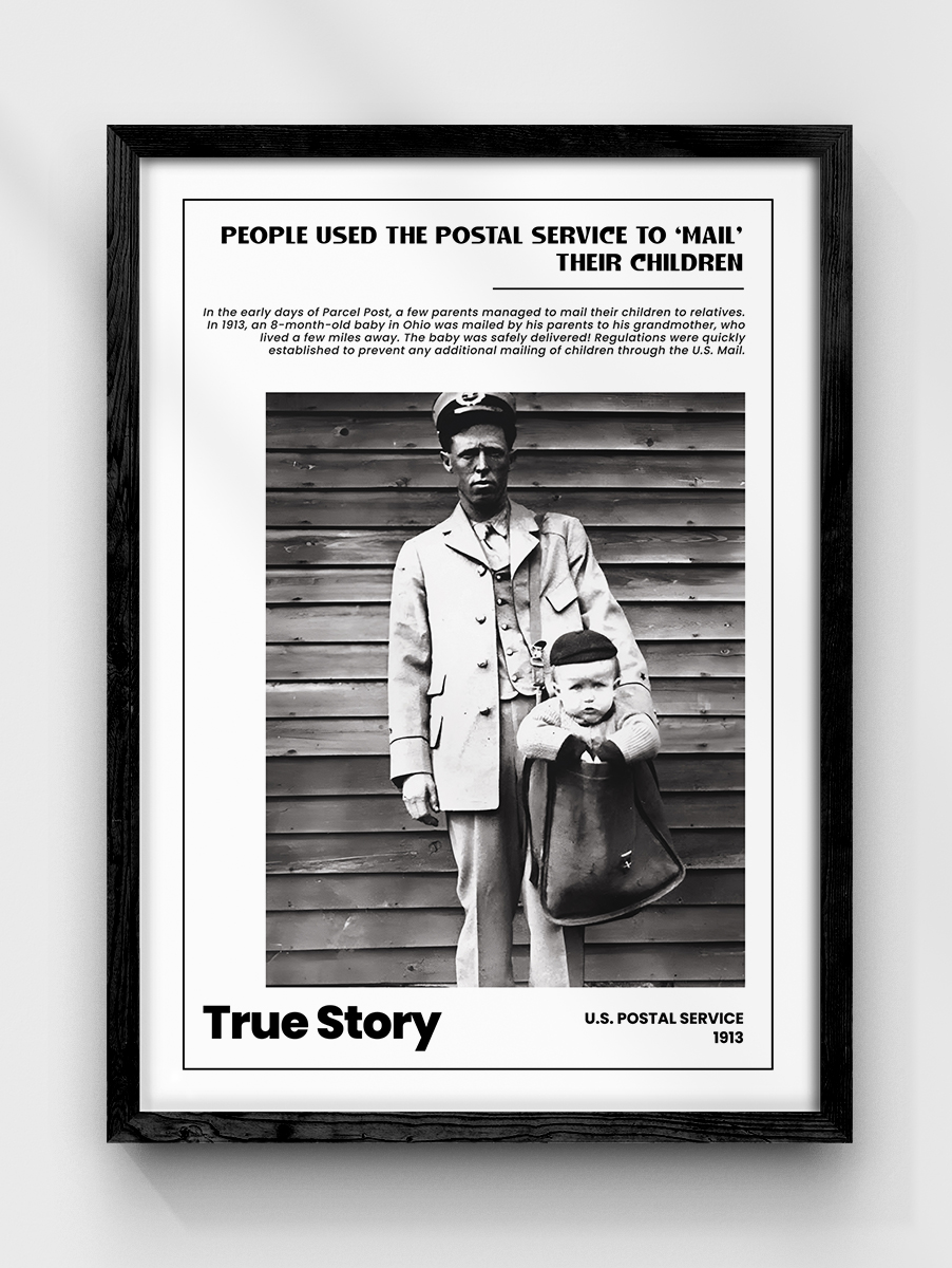 Në ditët e para të Parcel Post, disa prindër arritën t’u dërgonin me postë fëmijët e tyre të afërmve. Në vitin 1913, një foshnje 8-muajshe në Ohio u dërgua nga prindërit te gjyshja e tij, e cila jetonte disa kilometra larg. Foshnja u dërgua në mënyrë të sigurtë!