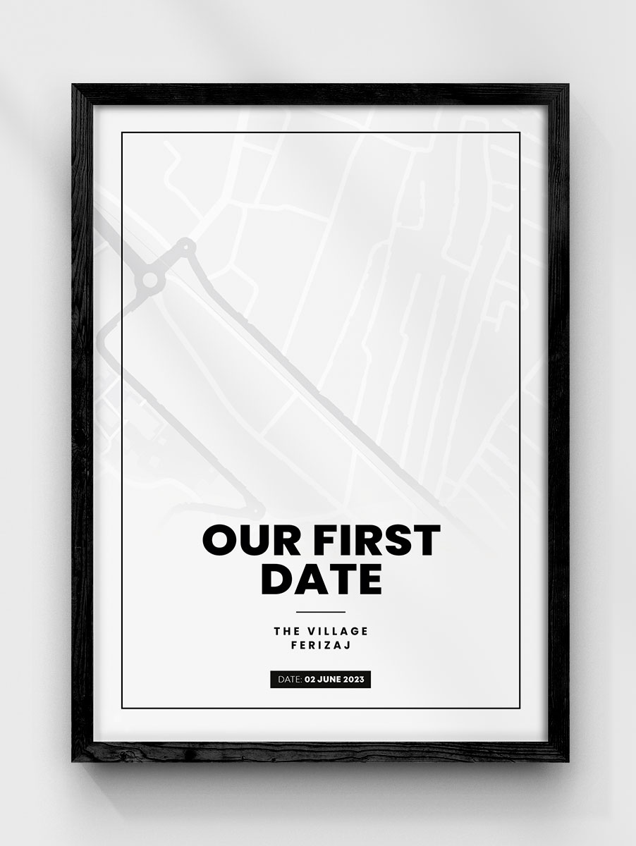 Korniza e personalizuar me hartë moderne. Ju mund ta shtypni takimin tuaj të parë me partnerin tuaj (lokacionin dhe datën) si kujtim përmes kornizave të personalizuar. Produkti mund të shtypet në formatin A2, A3 dhe A4.